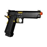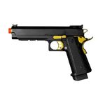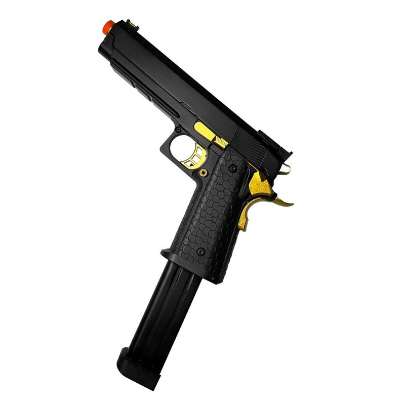 A Pistola Airsoft Double Bell 1911 Hi-Capa 79A é uma réplica premium desenvolvida para jogadores e colecionadores que buscam realismo máximo, desempenho confiável e acabamento diferenciado. Inspirada na consagrada plataforma 1911 Hi-Capa, este modelo se destaca pelo visual preto com detalhes dourados, aliado à construção Full Metal, garantindo robustez, durabilidade e excelente sensação no manuseio.