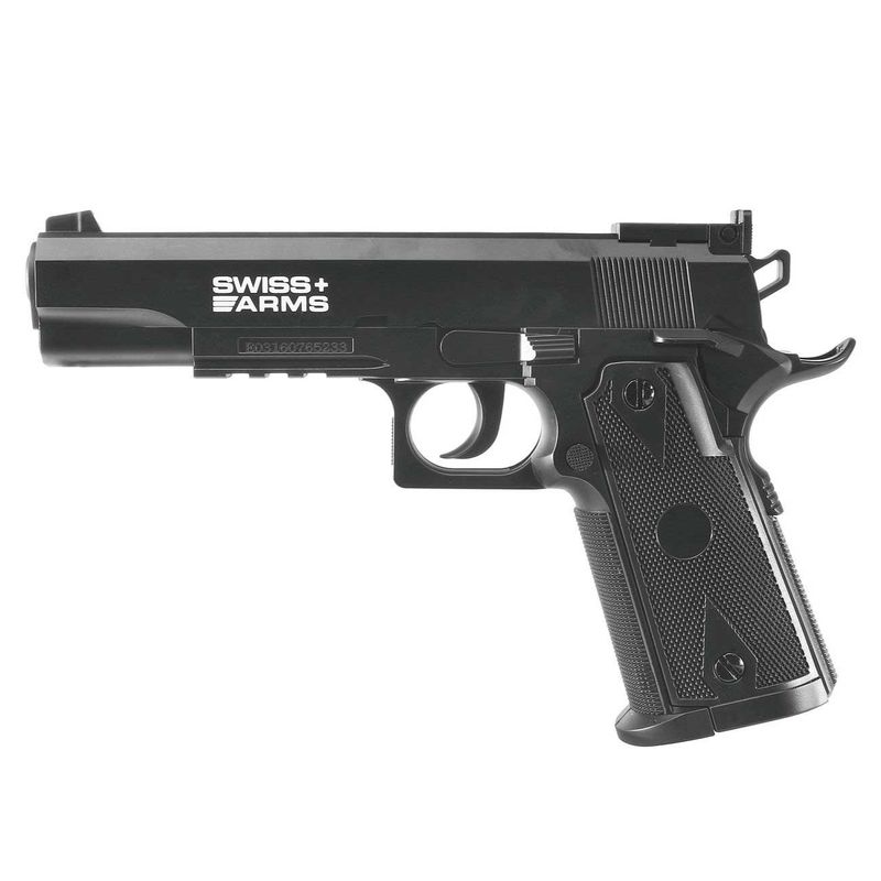 Pistola Swiss Arms réplica da lendária pistola 1911 como uma variante de CO2 no calibre 4.5mm esfera de aço. O original foi apresentado como uma arma de serviço dos EUA em 1911 e mais tarde foi adotado pela Royal Air Force, Royal Navy e Royal Flying Corps.