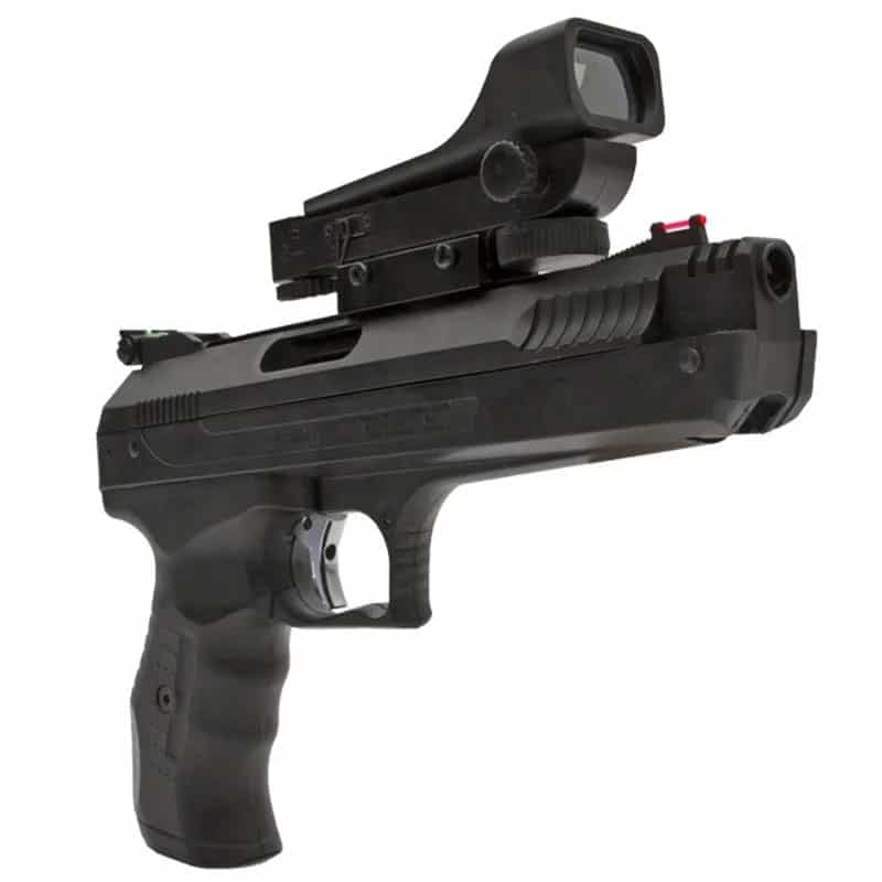 A Pistola Airgun Beeman 2006 5,5mm possui um Red Dot 1x20x30 original instalado de fábrica com regulagem vertical e horizontal e retícula de ponto vermelho.