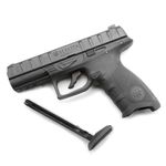 A pistola APX Blowback da Beretta é fabricada com o frame (corpo) em polímero e ferrolho em metal, assim como a versão de fogo.