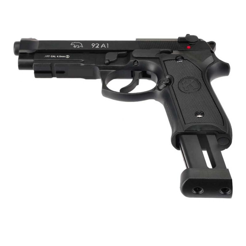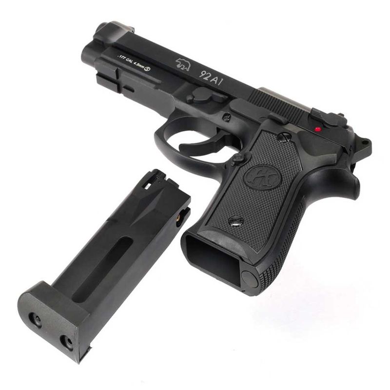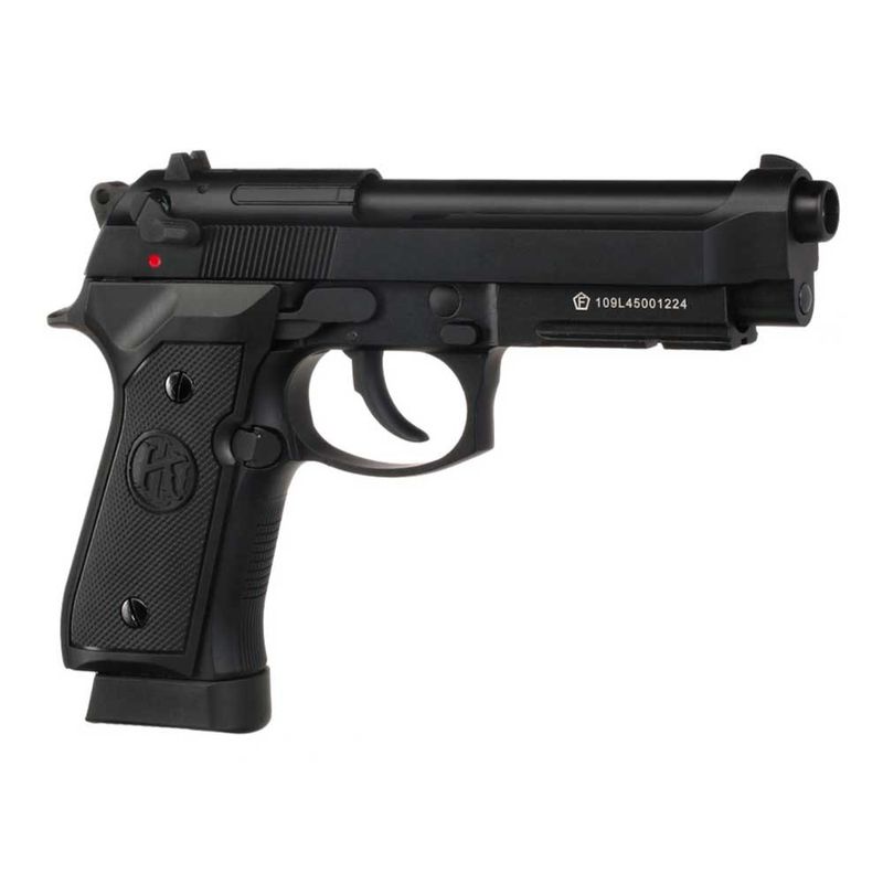 Simplesmente linda: A Pistola Beretta M92 A1 com trilho é uma das pistolas mais cobiçadas do mundo e finalmente está disponível em uma versão Airgun Co2, ou seja, uma pistola de pressão full metal, blowback e totalmente realista.