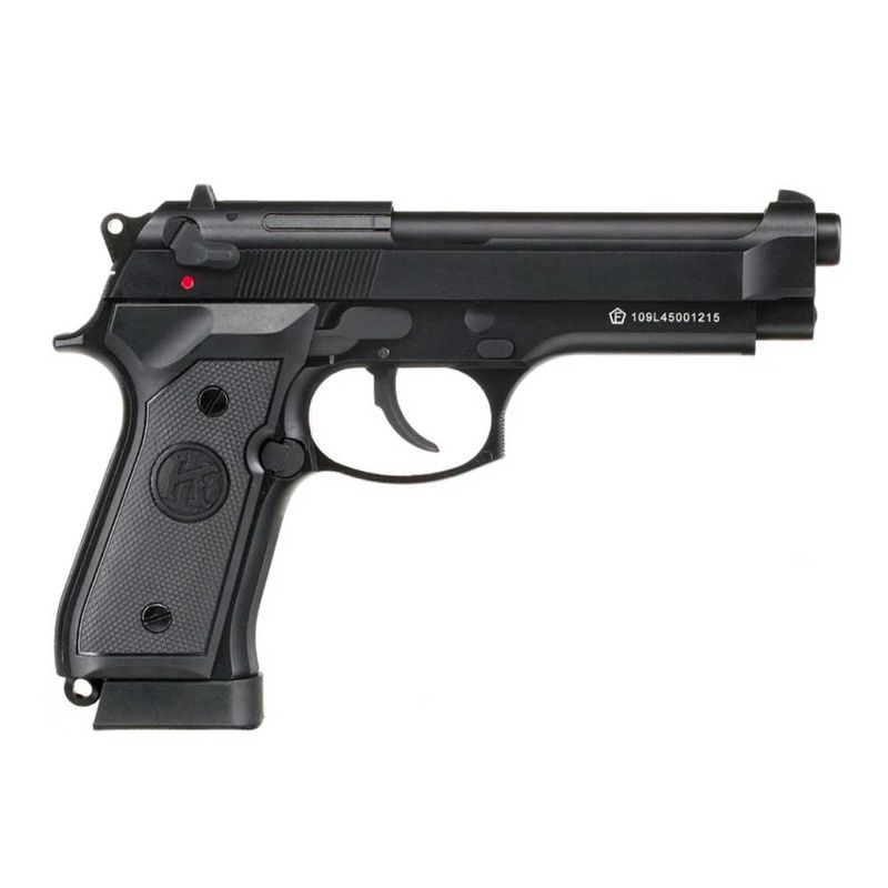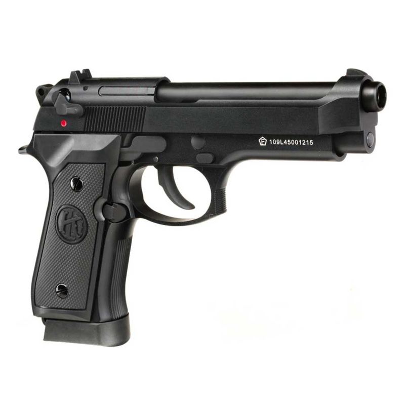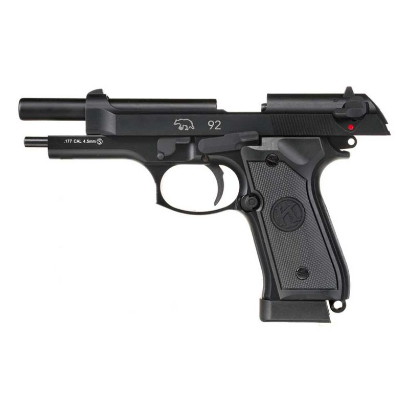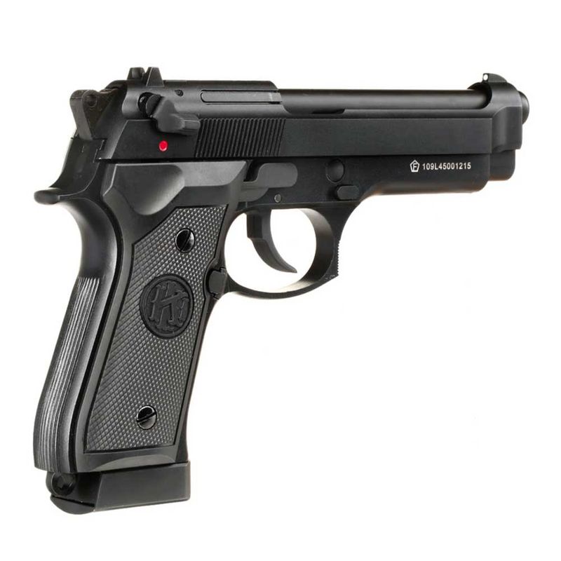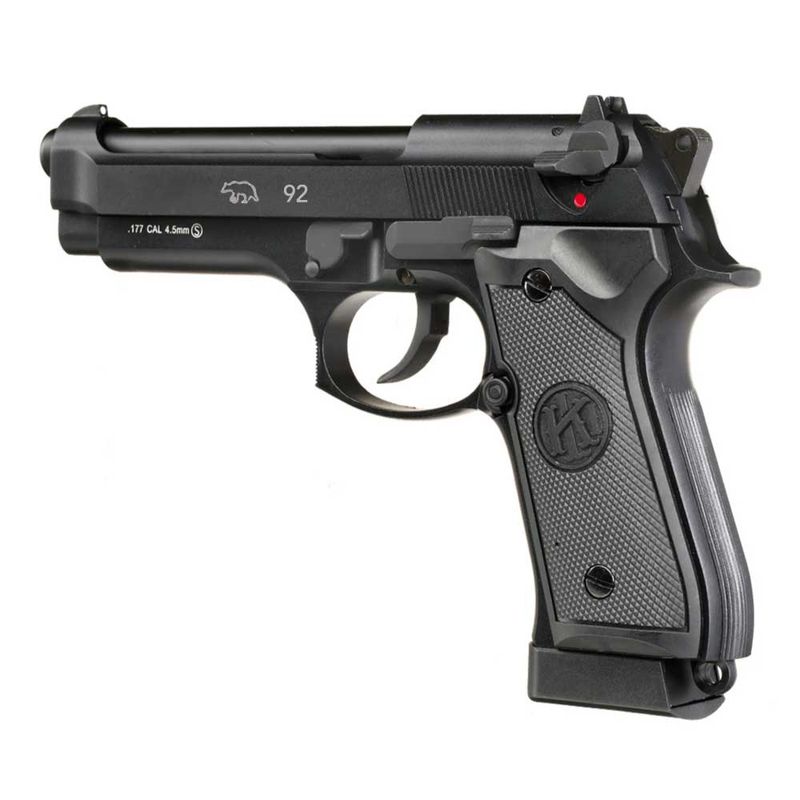 Principais detalhes da Pistola KLI M92 CO2 cal. 4,5mm Blowback: A pistola M9 Preta da QGK/KLI possui velocidade média de 311fps (95m/s) com esferas de aço 4,5mm.