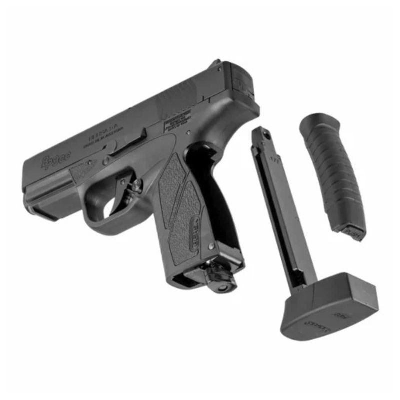 Seu ferrolho em metal e frame em polímero oferecem um equilíbrio perfeito entre realismo e leveza. A pistola conta ainda com mira de 3 pontos, trilho Picatinny de 22mm para acessórios, magazine para 20 esferas de aço e número de série individual.