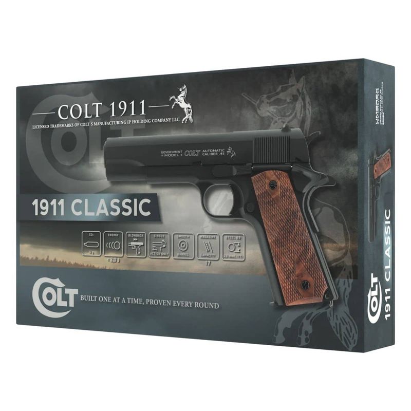 A Colt 1911 Classic oferece uma velocidade boa e padrão em armas com blowback realístico, batendo médias de 320fps (97,5 m/s) com esferas de aço padrão, calibre 4,5mm de 0,36g.