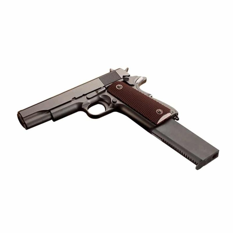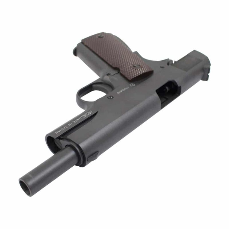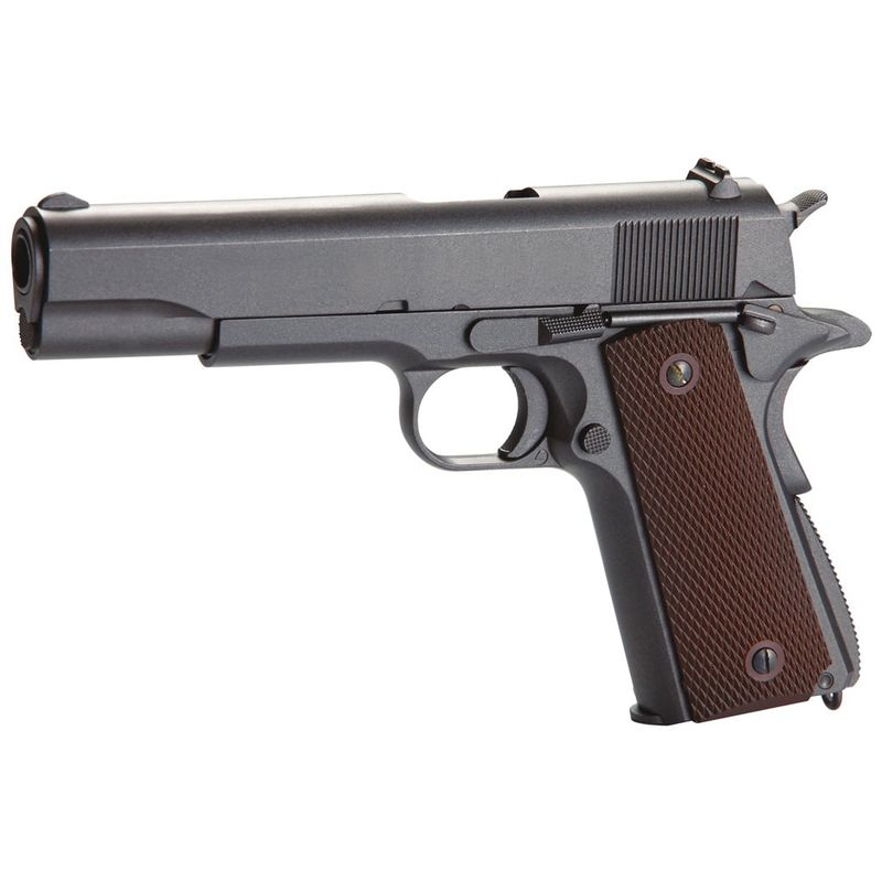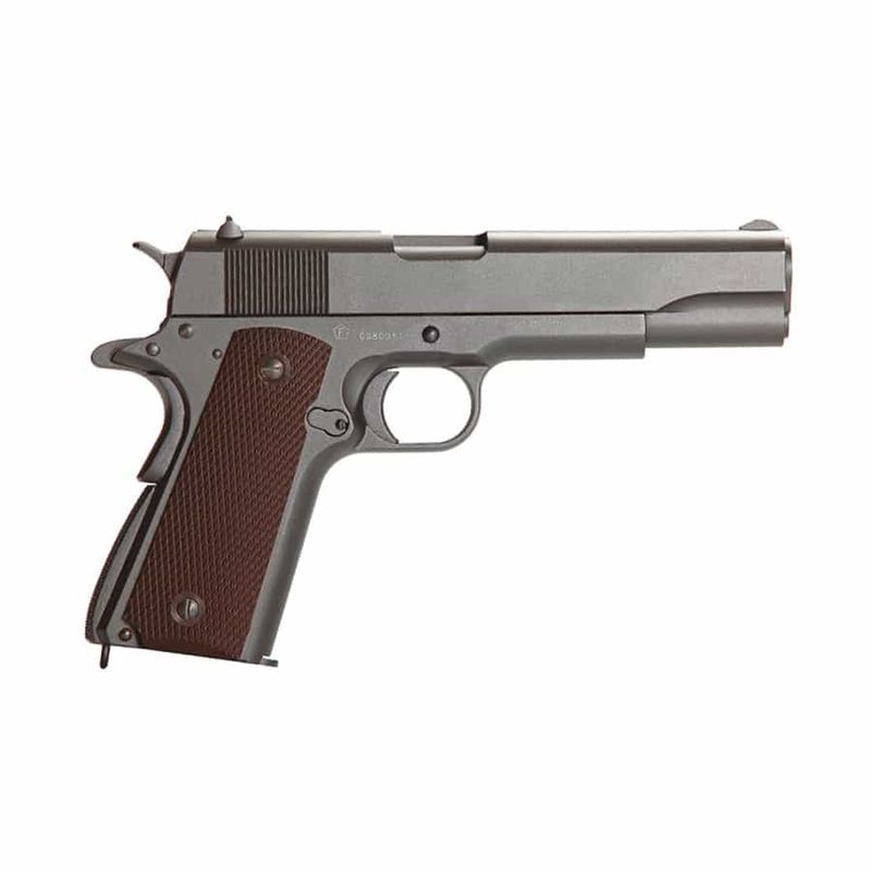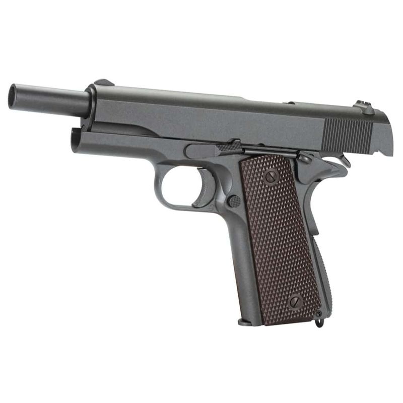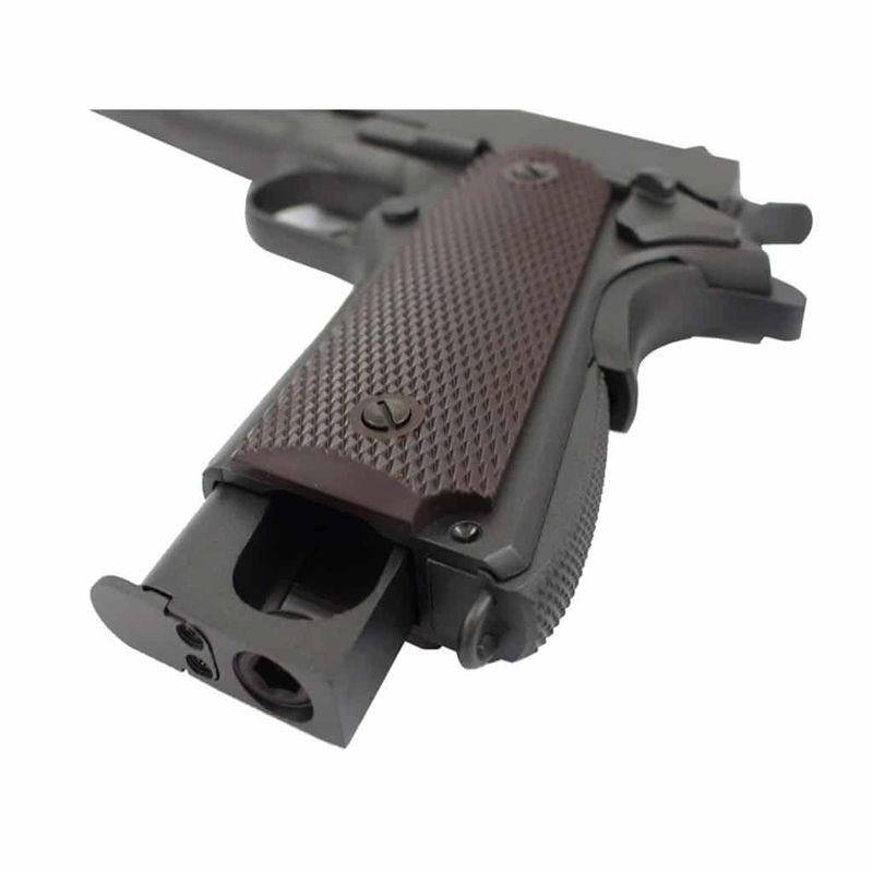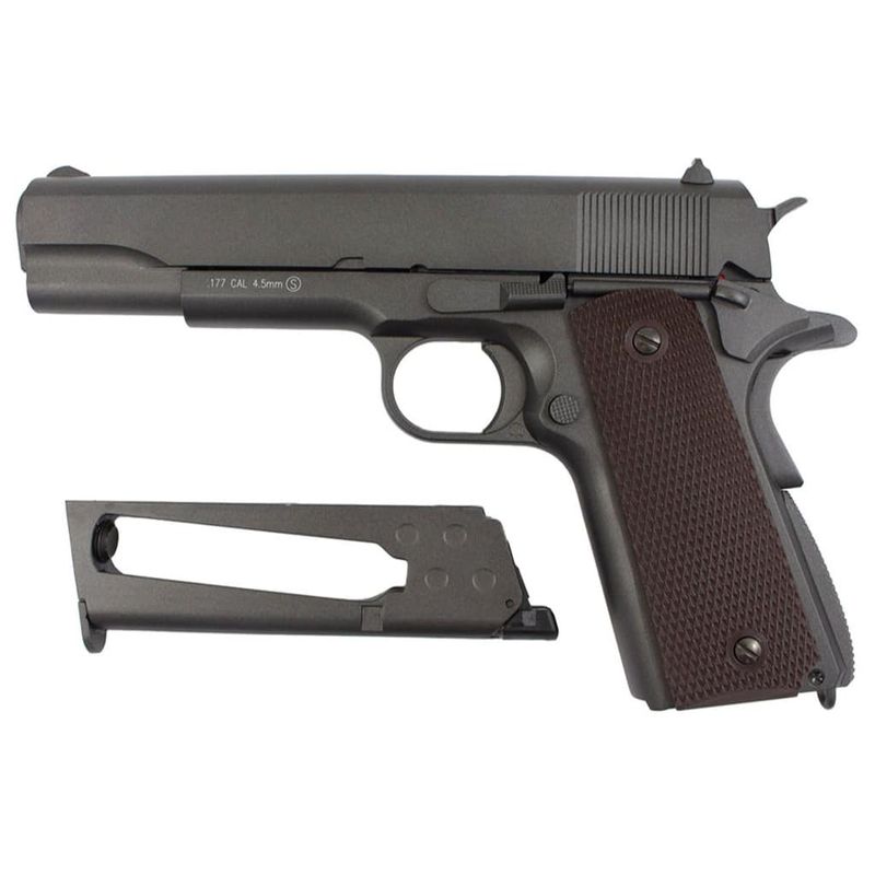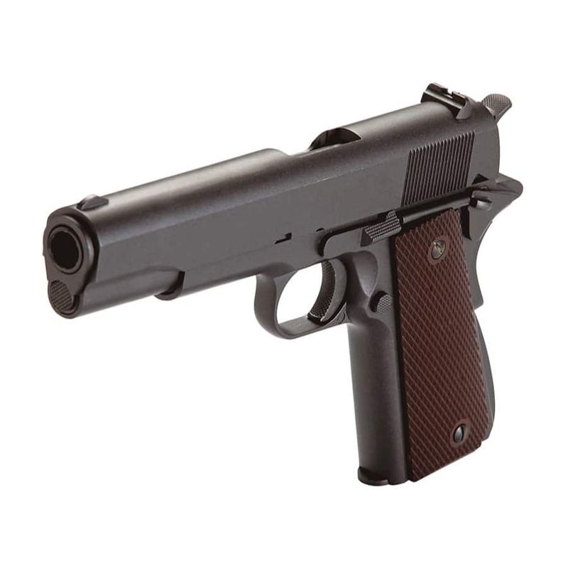 Na versão airgun, a 1911 KWC CO2 4,5mm entrega realismo e desempenho. Fabricada inteiramente em Full Metal, pesa cerca de 900g e tem dimensões reais com 21,8cm de comprimento. Possui sistema blowback funcional, travas reais e ferrolho que para aberto ao esvaziar o magazine — assim como o modelo original de fogo.