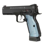 A empunhadura com painéis de alumínio anodizado azul e xadrez pronunciado oferece aderência superior; o guarda-mato estendido e os cortes no beavertail permitem empunhar mais alto, reforçando a estabilidade.