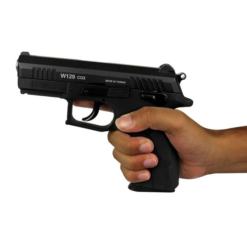 A pistola Rossi W129 possui corpo em polímero e ferrolho/slide em metal, assim como sua arma "mãe", além de contar com sistema Blowback, que faz o recuo para trás a cada disparo, deixando o gatilho mais suave para o próximo disparo, além de dar mais realismo para cada tiro.