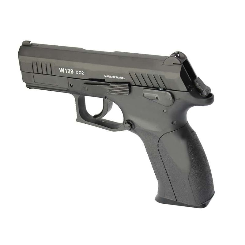 A pistola Rossi W129 possui corpo em polímero e ferrolho/slide em metal, assim como sua arma "mãe", além de contar com sistema Blowback, que faz o recuo para trás a cada disparo, deixando o gatilho mais suave para o próximo disparo, além de dar mais realismo para cada tiro.