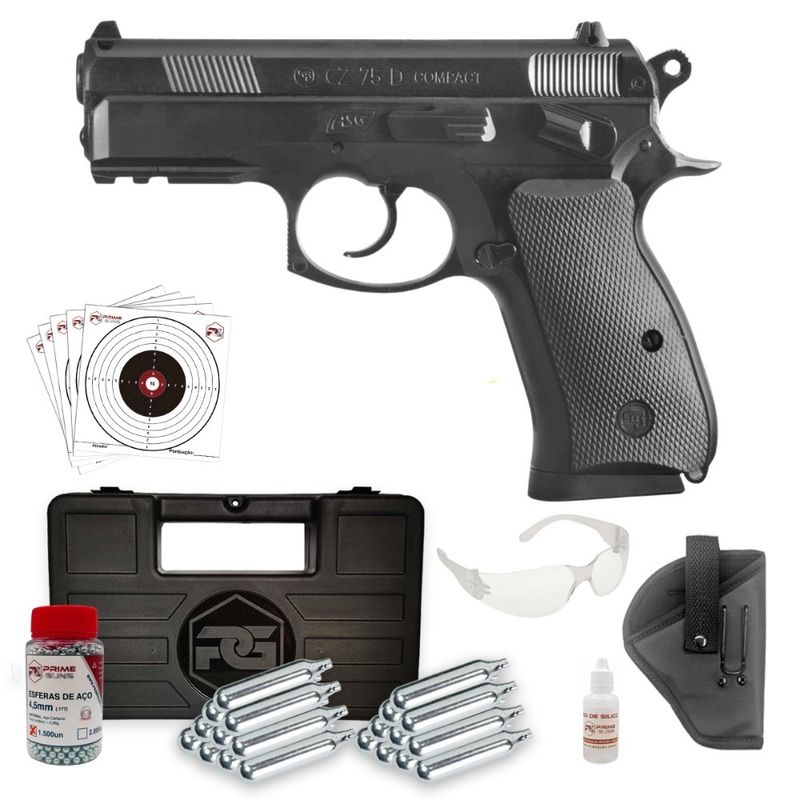 A Pistola Airgun CZ75D Compact Co2 4,5mm + Super Kit dispara no modo Semi Automática com velocidade de 380fps - 115m/s e energia de 2,4 Joules Ver mais