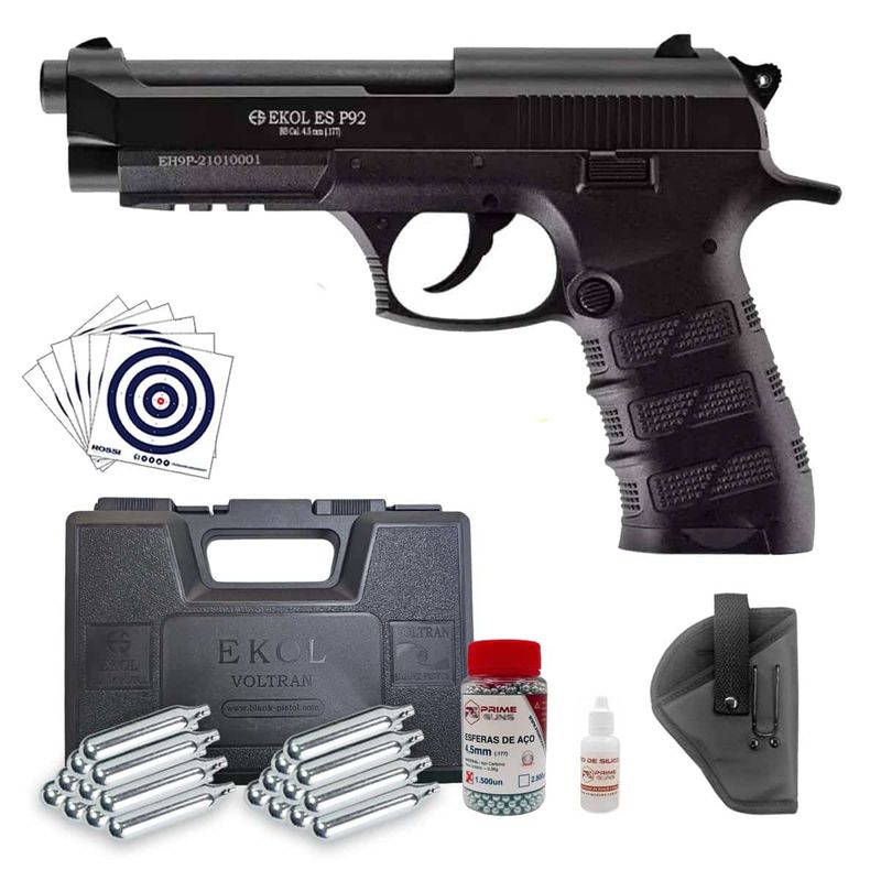 A pistola Ekol ES P92 dispara esferas de aço 4,5mm (.177) a uma velocidade de 492fps (150m/s).