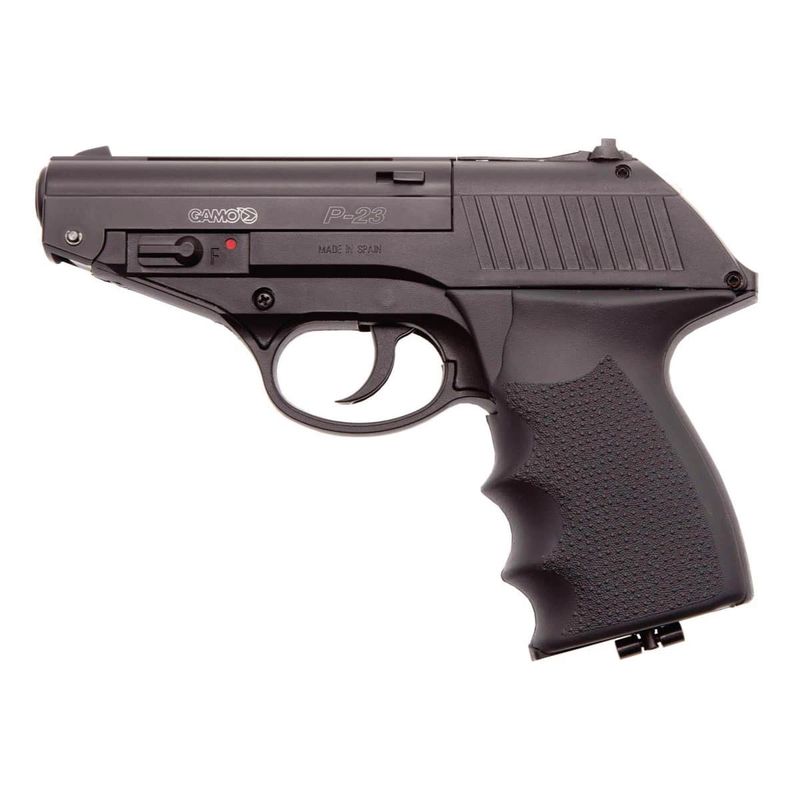 Marca: GAMO Modelo: P-23 Combat Calibre: 4.5mm Velocidade: 410 FPS (125 m/s) Capacidade: 12 Esferas de Metal Funcionamento: CO2 12g Modo de Disparo: Semi Trava de Segurança Manual: Sim Material Slide: Metal Material Corpo: Polímero Blowback: Não Mira: Fixa Comprimento: 19cm Peso bruto: 465g