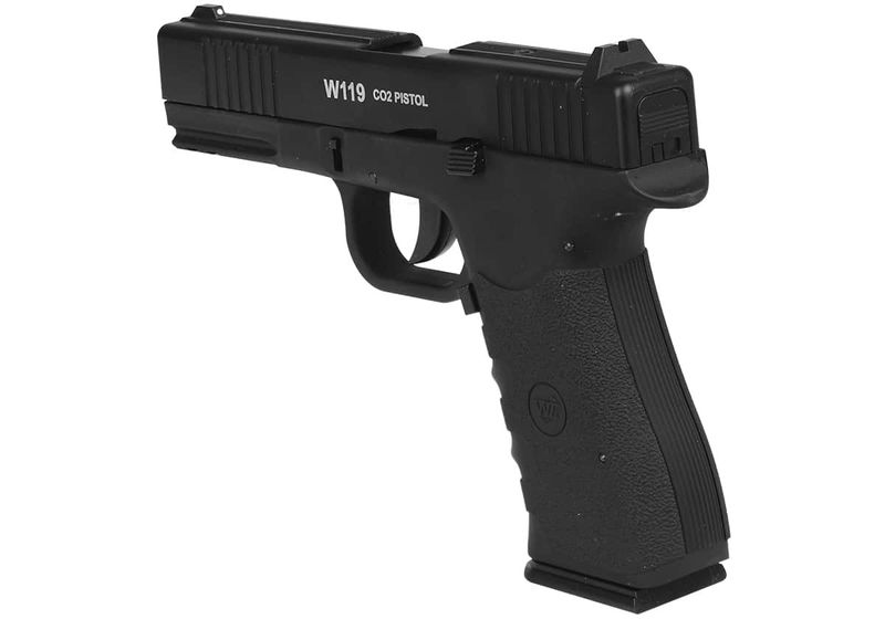 Mesmo com ação Blowback, que é o recuo do ferrolho a cada disparo, a pistola W119 Wingun possui mais de 420fps (120m/s) de velocidade e um cilindro de CO2 rende cerca de 60 bons disparos.