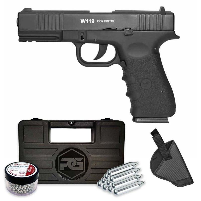 A Pistola Airgun Glock W119 Co2 Blowback 4,5mm Kit Coldre dispara no modo Semi Automática com velocidade de 420fps - 128m/s e energia de 3 Joules Ver mais