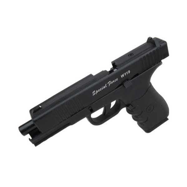 A Pistola W119 possui capacidade para 16 esferas de aço no magazine inteiriço.
