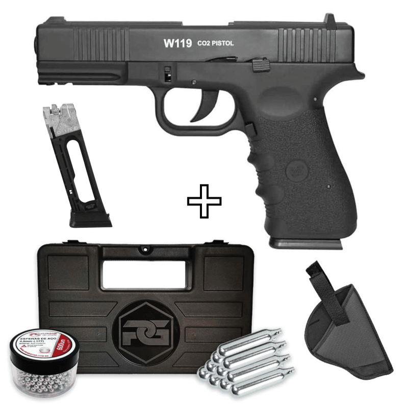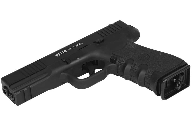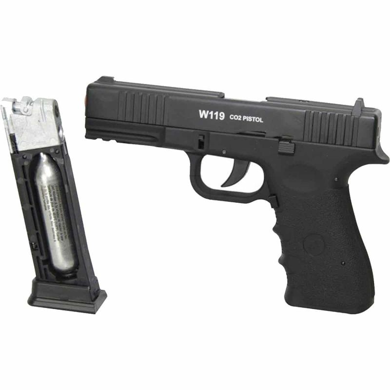 A Pistola W119 possui capacidade para 16 esferas de aço no magazine inteiriço.