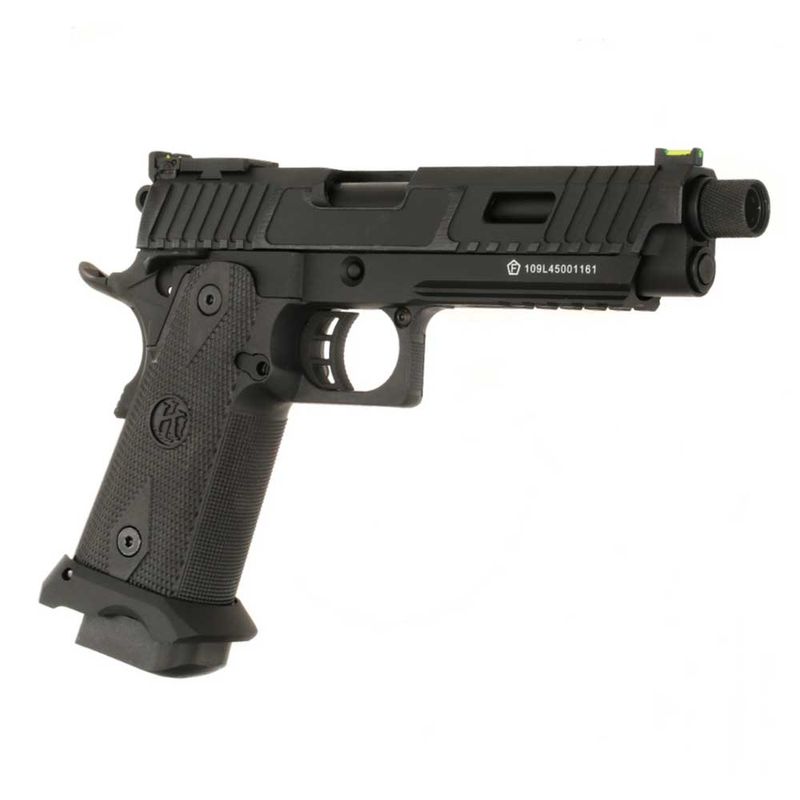 Somente o punho com guarda-mato é feito de polímero composto, como é típico nas pistolas Hi-Capa 1911. A textura antiderrapante proporciona excelente controle da pistola, e a base de magazine em alumínio facilita a troca rápida dos carregadores.