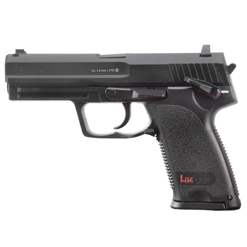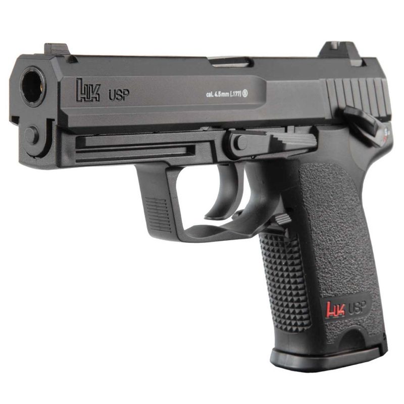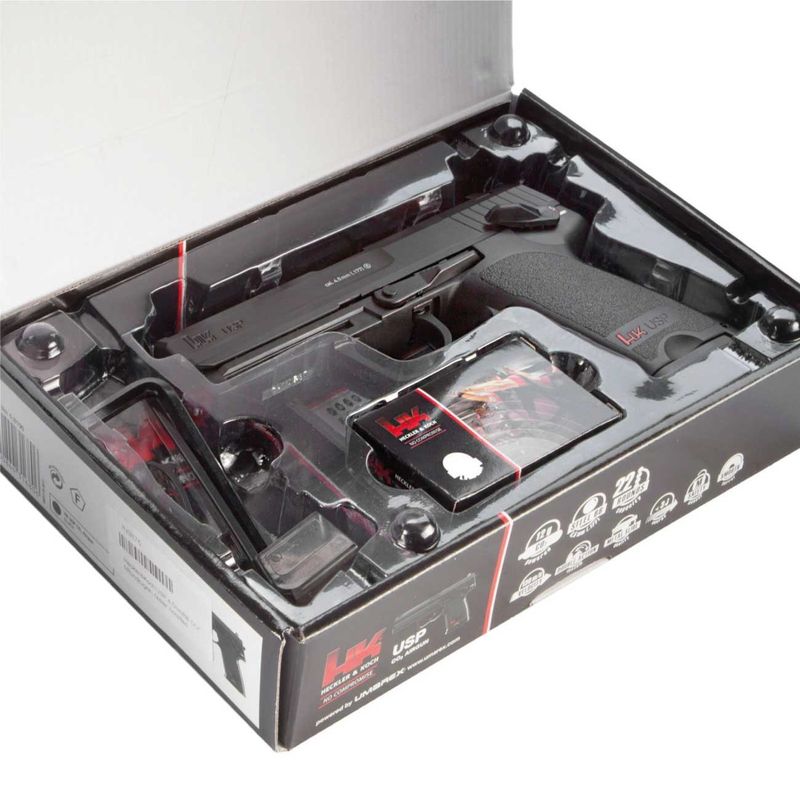 A pistola airgun HK USP Co2 4,5mm NBB da Umarex é uma arma de pressão que se assemelha à pistola Heckler & Koch USP (Universal Self-loading Pistol) real, uma pistola semiautomática popularmente utilizada por forças militares e de aplicação da lei em todo o mundo. A versão airgun é alimentada por cartuchos de CO2 e dispara esferas de aço calibre 4,5mm.