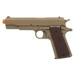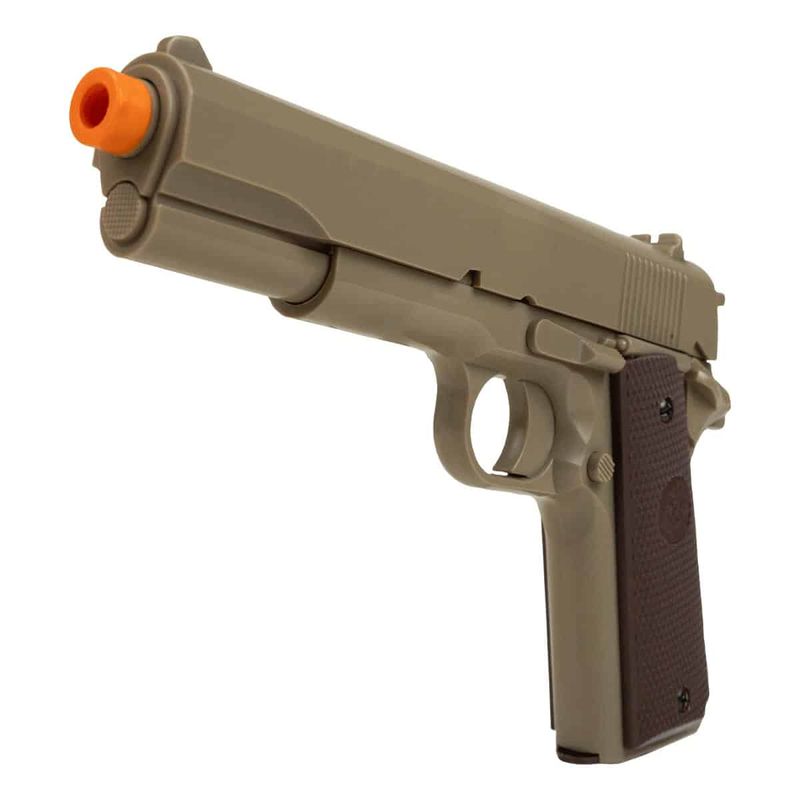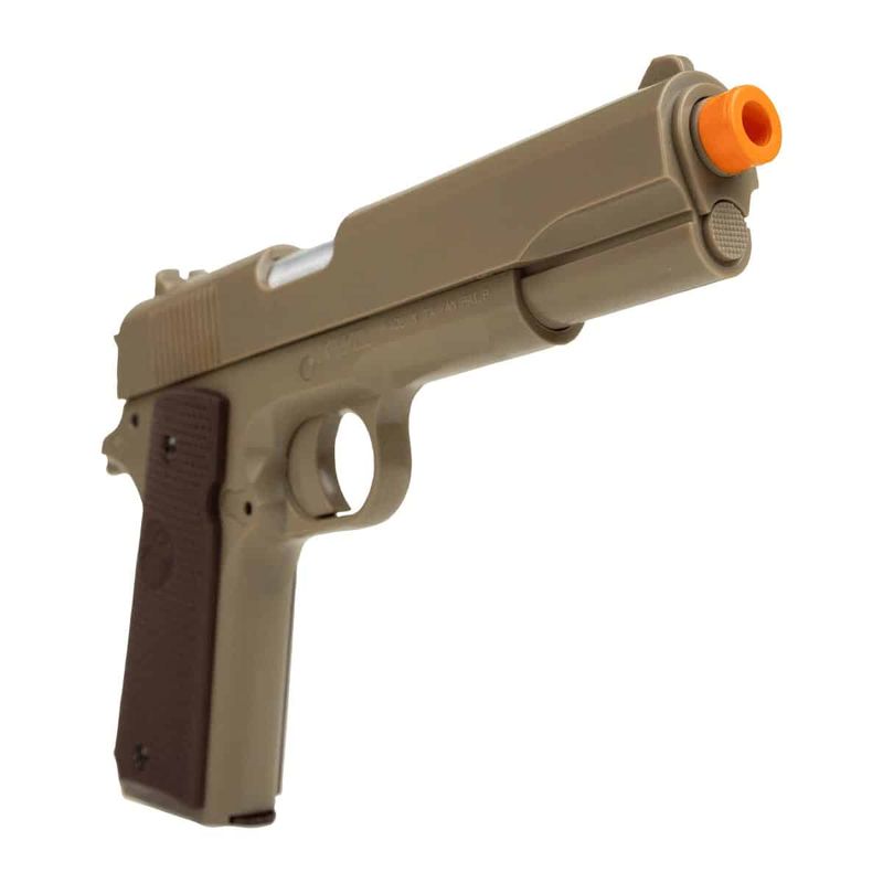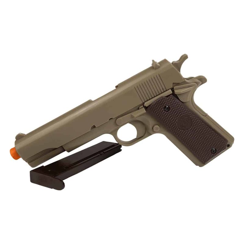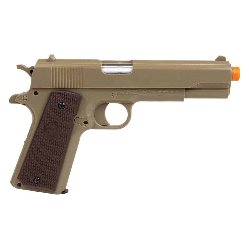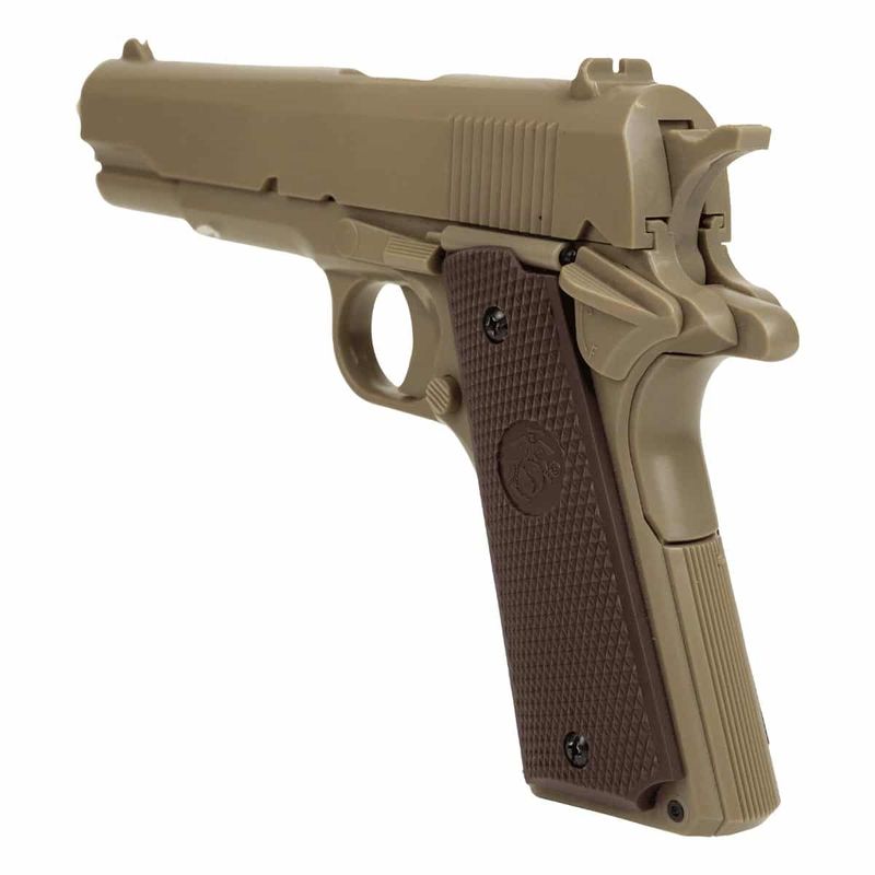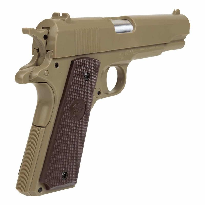 A Pistola Airgun KWC 1911 TAN Spring 6mm dispara no modo Um a um com velocidade de 186fps - 57m/s e energia de 0,4 Joules Ver mais