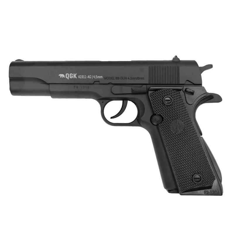 A pistola QGK 1911 é uma excelente réplica da clássica Colt M1911. Esta versão airgun é fabricada com ferrolho em metal (Full Metal Slide) e corpo em polímero, disparando esferas de aço calibre 4,5mm.