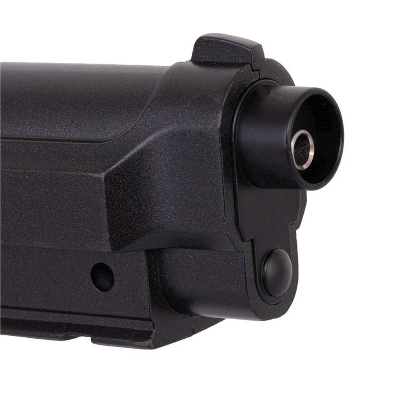 Com sistema NBB (Non-Blowback), o slide fixo proporciona maior economia de gás, permitindo até 120 disparos por cápsula de CO2 de 12g.