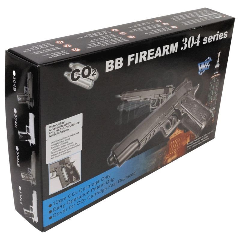 A pistola Rossi 1911 CO2 6mm possui uma velocidade média de 100m/s (328fps) com esferas 6mm de 0,86g.