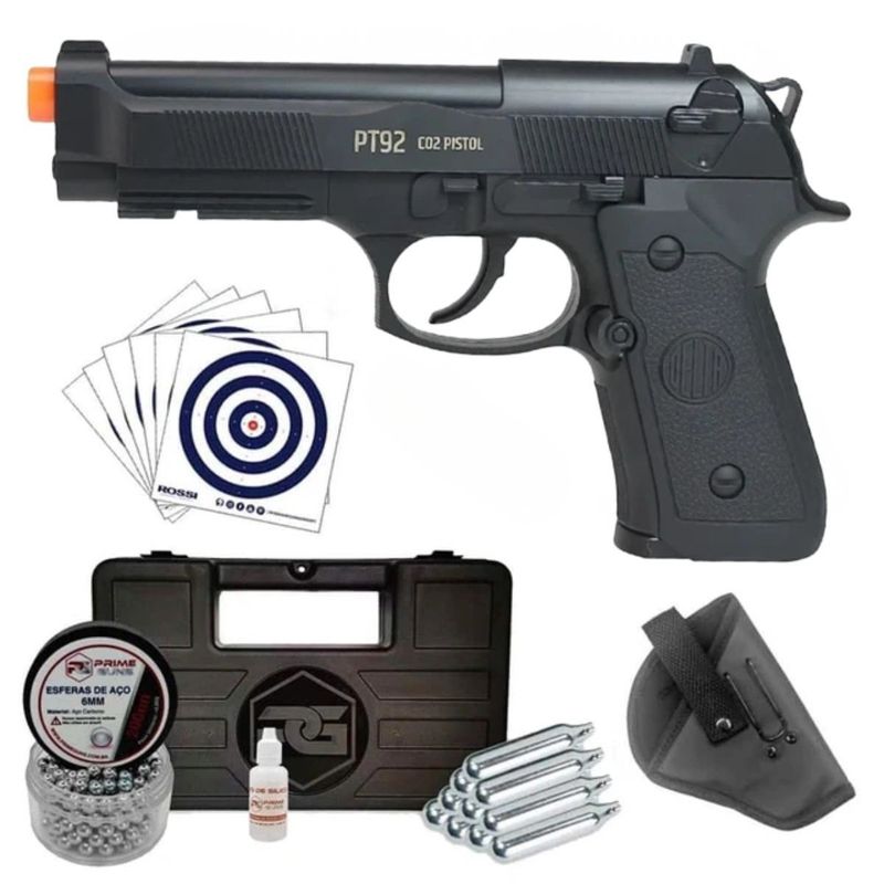 A Pistola Airgun Rossi PT92 Co2 6mm NBB Delta + Coldre dispara no modo Semi Automática com velocidade de 328fps - 100m/s e energia de 4,4 Joules Ver mais