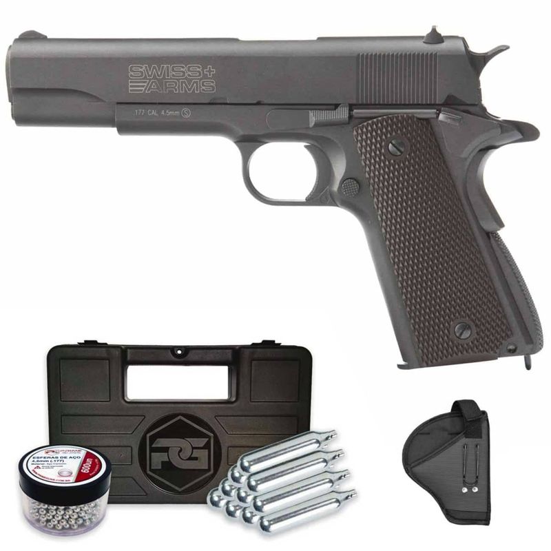 A Swiss Arms 1911 oferece uma velocidade boa e padrão em armas com blowback realístico, batendo médias de 320fps (97,5m/s) com esferas de aço padrão, calibre 4,5mm de 0,36g