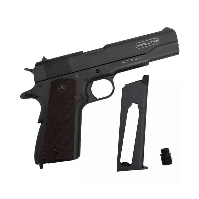 A pistola SA 1911 Airgun é uma das réplicas da Colt M1911 mais bem feitas e realista disponíveis no mercado de armas de pressão. Ela é fabricada toda em metal e oferece uma construção bem sólida, firme e confortável de manusear.