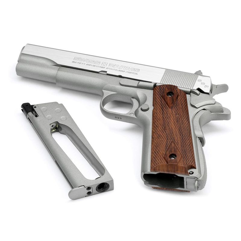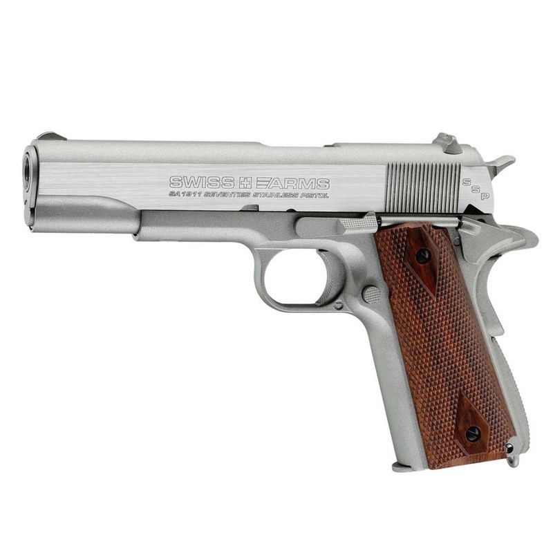 A pistola airgun CO2 Swiss Arms SA 1911 Stainless no calibre 4,5 mm é indicada para tiro recreativo e para colecionadores. Uma réplica totalmente em metal da pistola mundialmente famosa 1911, com acabamento de alta qualidade e design moderno em aço inoxidável.