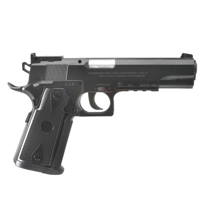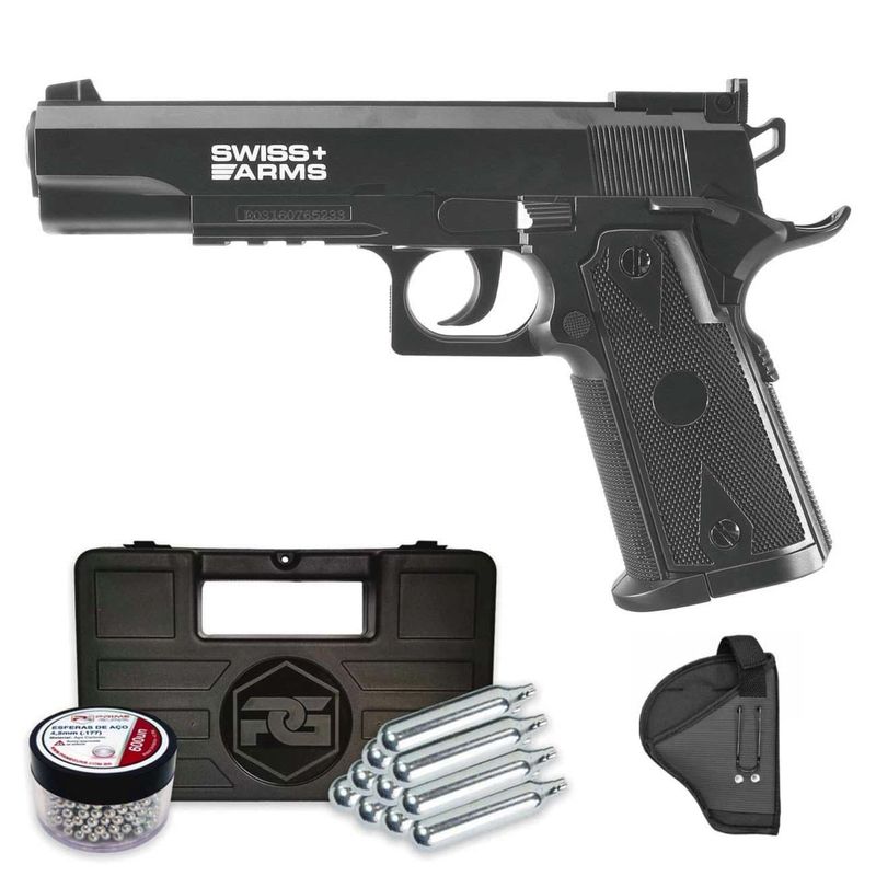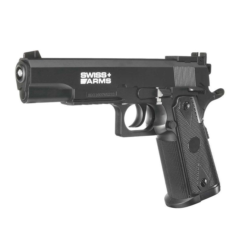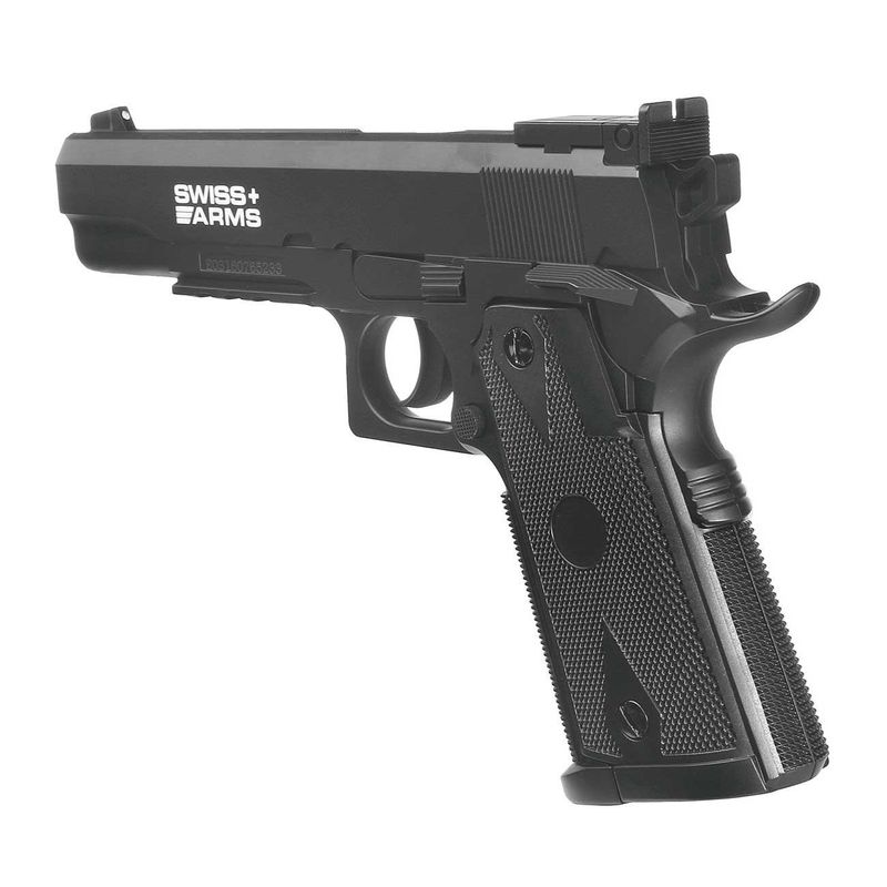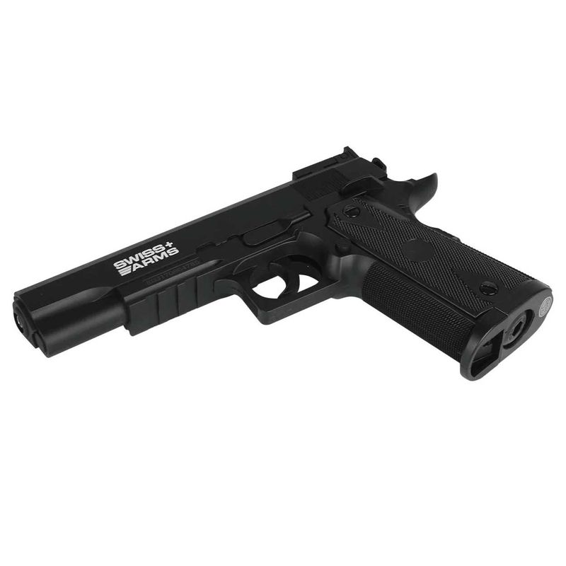 Pistola Swiss Arms réplica da lendária pistola 1911 como uma variante de CO2 no calibre 4.5mm esfera de aço. O original foi apresentado como uma arma de serviço dos EUA em 1911 e mais tarde foi adotado pela Royal Air Force, Royal Navy e Royal Flying Corps.