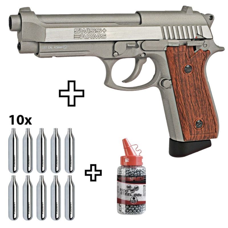 A pistola de ar Swiss Arms SA92 CO2 vem no calibre BB de 4,5 mm para atiradores recreativos e amadores. A réplica toda em metal de uma pistola de renome mundial dispara BBs de aço de calibre 4,5 mm - basta usar seu tipo ou marca favorita. O acabamento de alta qualidade da pistola de ar tem um design moderno em aço inoxidável e também fica bem em uma vitrine.