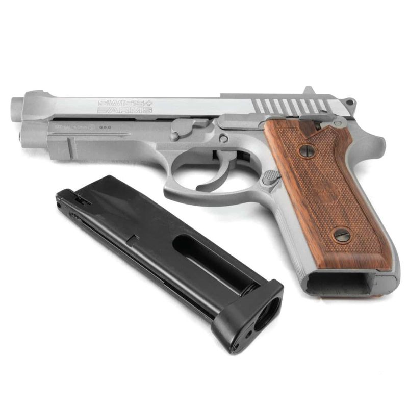 A pistola Swiss Arms P92 Silver possui capacidade para 21 esferas de aço 4,5mm que vão num magazine realístico que comporta também o cilindro de CO2 12g.
