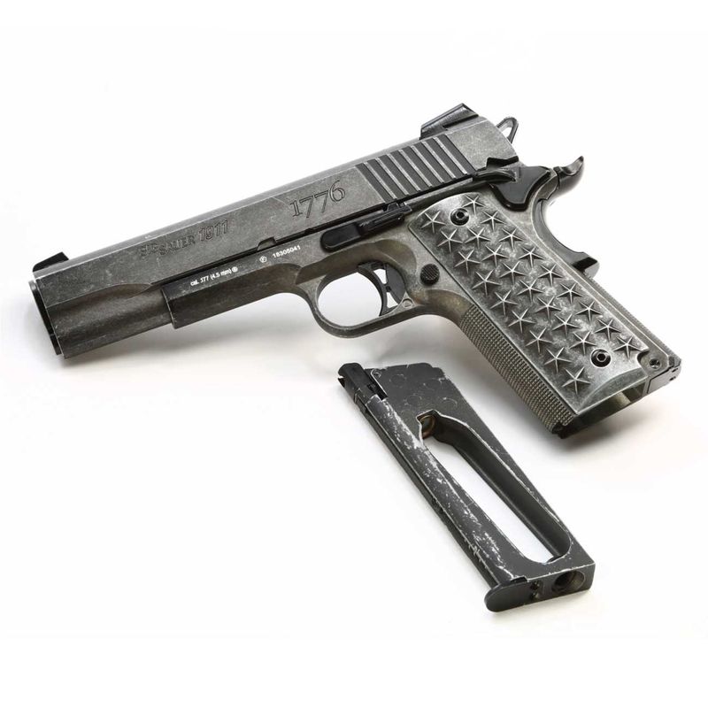 A pistola 1911 We The People da Sig possui capacidade para 18 esferas de aço 4,5mm que vão em um magazine realístico que também comporta o cilindro de CO2 12g.