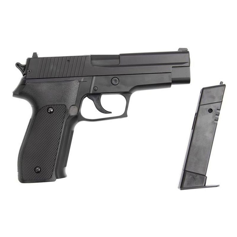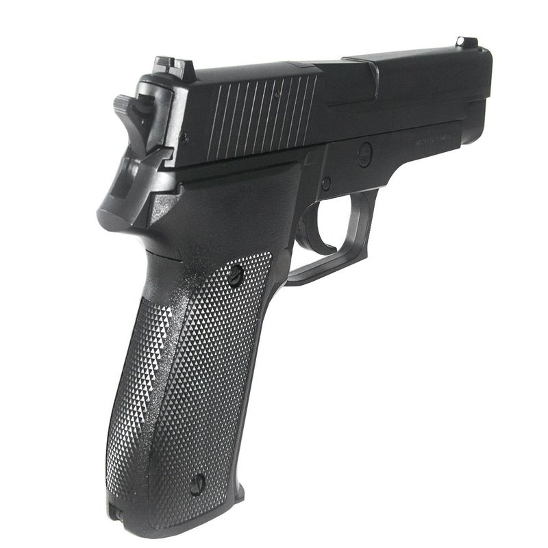 A Pistola Sig Sauer P226 Spring da KWC é uma pistola de mola que não exige cilindros de CO2, gás ou outro propulsor para funcionar. Basta puxar o ferrolho/slide da arma para trás para atirar as esferas de aço 4,5mm.