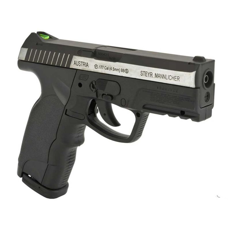A Steyr M9-A1 Airgun dispara esferas de aço calibre 4,5mm com uma impressionante velocidade de até 450fps (137 m/s), impulsionada por cápsulas de CO2 de 12g.