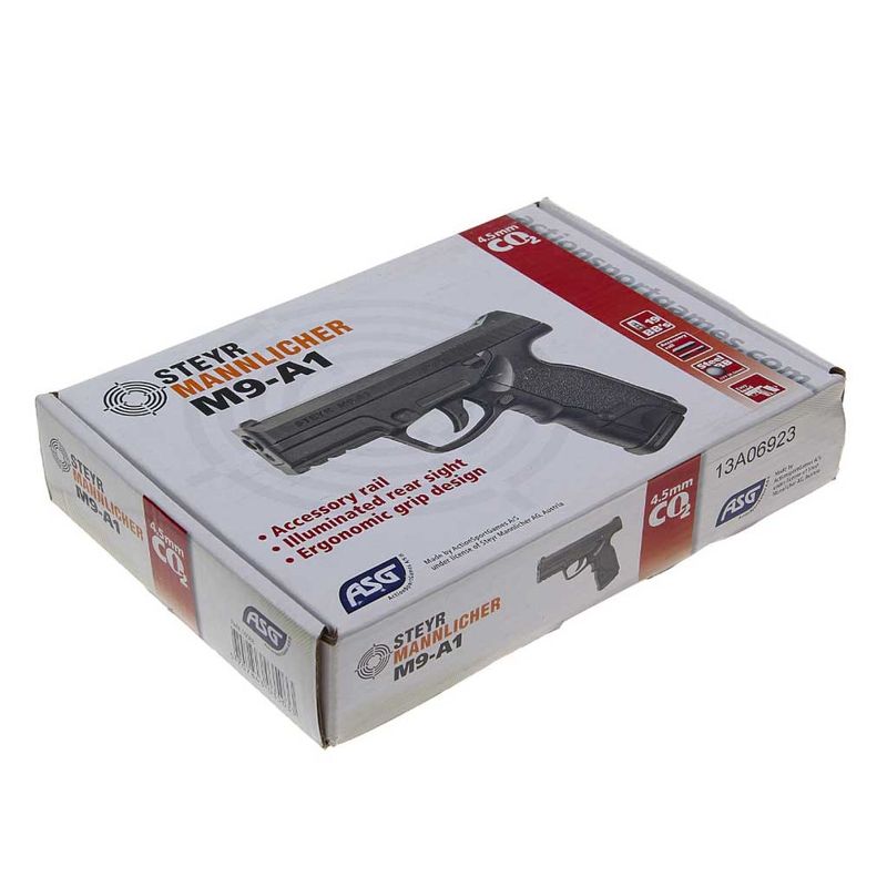 A Steyr M9-A1 Airgun dispara esferas de aço calibre 4,5mm com uma impressionante velocidade de até 450fps (137 m/s), impulsionada por cápsulas de CO2 de 12g.