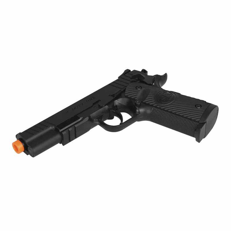 A Duty One dispara BBs de 6mm a uma velocidade média de até 410fps (125 m/s) e possui capacidade para 16 esferas, com mira fixa e excelente ergonomia. Todos os detalhes, desde o acabamento até o peso equilibrado, conferem um alto nível de realismo e controle no disparo.