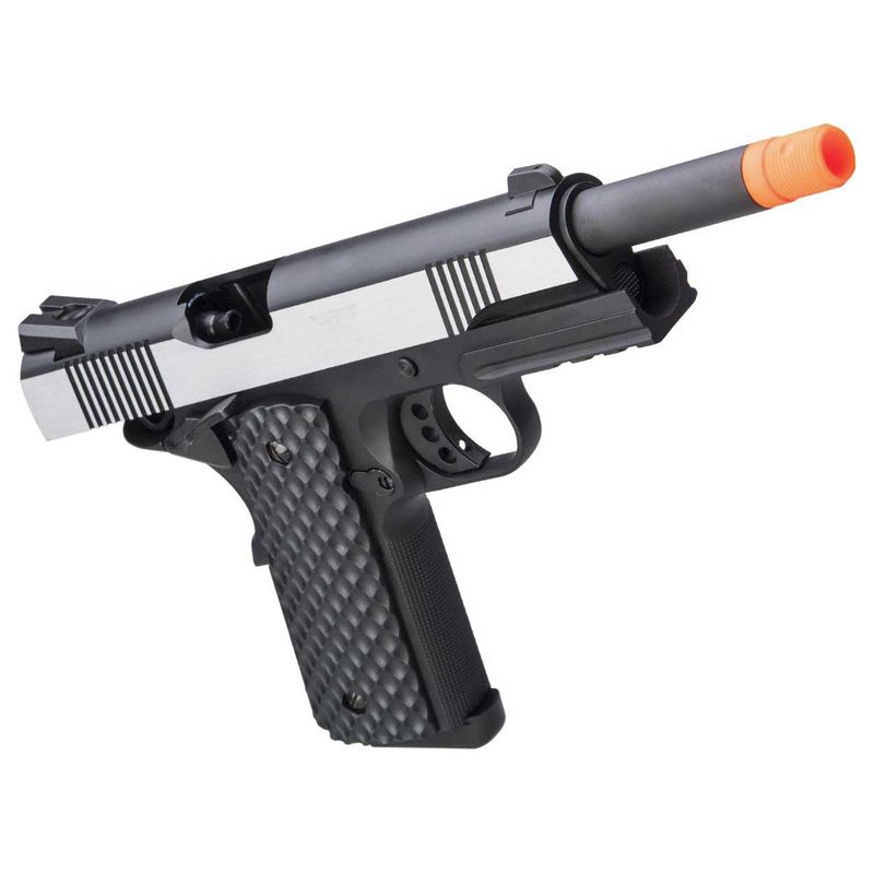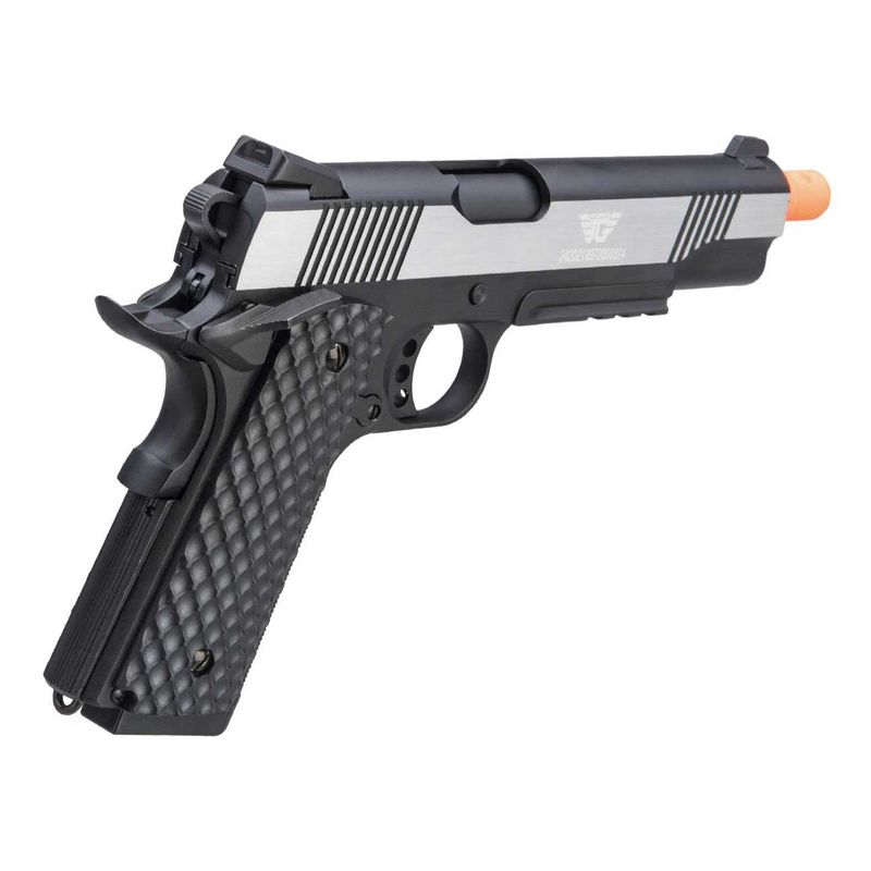 A M1911 Dual Tone da JG Works dispara BBs de 6mm a uma velocidade de 300fps. O uso de esferas de aço é proibido.