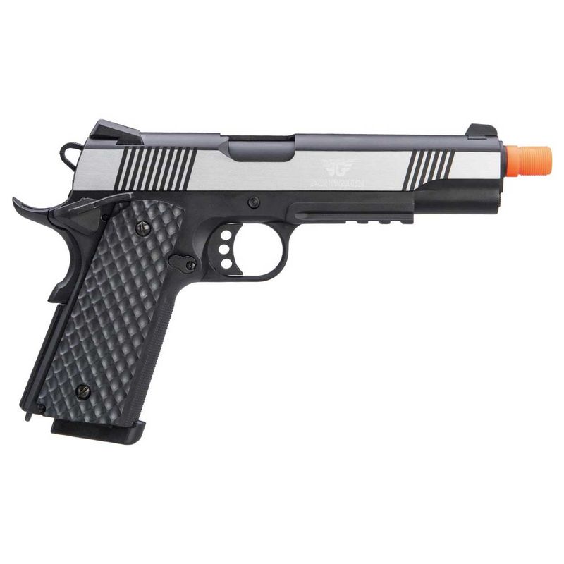 A M1911 Dual Tone da JG Works dispara BBs de 6mm a uma velocidade de 300fps. O uso de esferas de aço é proibido.