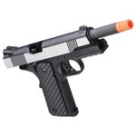 A M1911 Dual Tone da JG Works dispara BBs de 6mm a uma velocidade de 300fps. O uso de esferas de aço é proibido.