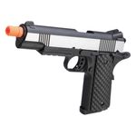A Pistola Airsoft 1911 Dual Tone Cromado JG Works GBB dispara no modo Semi Automática com velocidade de 300fps - 91m/s e energia de 0,84 Joules Ver mais