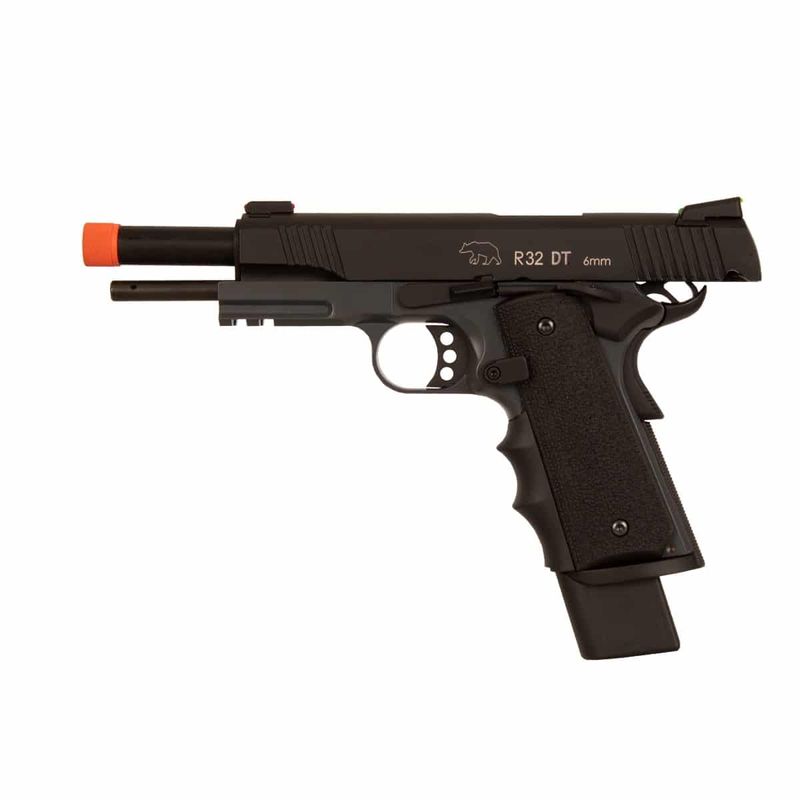A Pistola M1911 A1Airsoft R32DT GBB Army Armament Blowback 6mm é seguramente bem projetada e construída. Ela apresenta um carregador estendido reforçado em metal que pode acomodar até 30 BBs 6mm. É capaz de disparar qualquer projétil BB de plástico de 6 mm, mas segundo o fabricante, seu desempenho se sai melhor em BBs 0.20g. Os tiros podem atingir uma velocidade de 320 fps - 98 m/s!