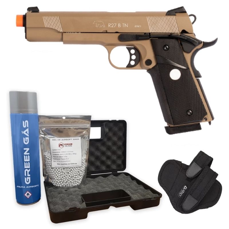 Pistola Airsoft 1911 MEU Full Metal TAN GBB Army 6mm Kit Coldre