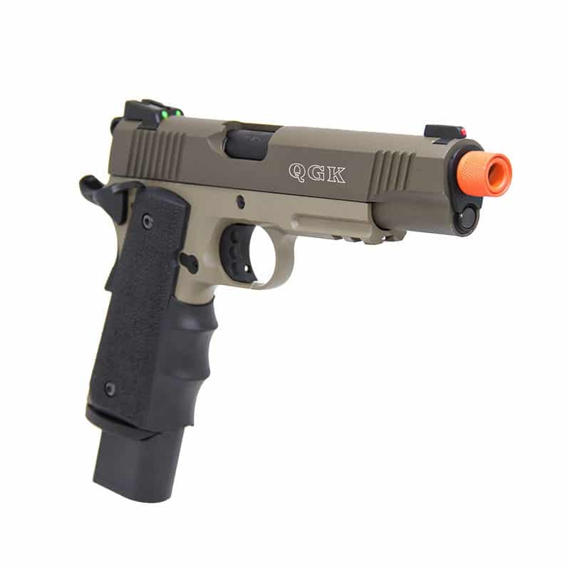 Fabricada pela Army Armament e licenciada pela QGK, esta pistola traz corpo Full Metal, mira em fibra óptica, empunhadura texturizada e detalhes que imitam madeira, com acabamento em cor TAN (desert). Conta com trilho inferior de 20mm (4,4cm) para fixação de acessórios como lanternas.