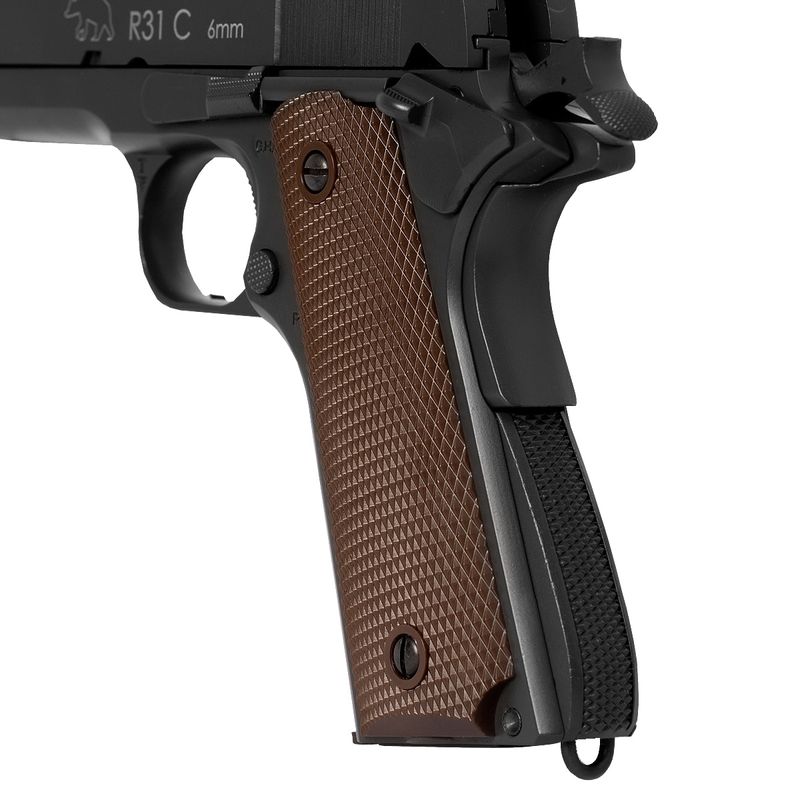 A M1911 R31 BK Army Armament é uma réplica fiel em escala real, com corpo full metal, blowback realista, travas funcionais e empunhadura texturizada que simula madeira.
