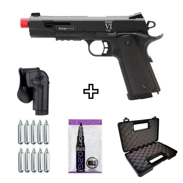 A Pistola Airsoft 1911 Rudis Secutor VI GBB Blowback + Coldre dispara no modo Semi Automática com velocidade de 300fps - 91m/s e energia de 0,83 Joules Ver mais