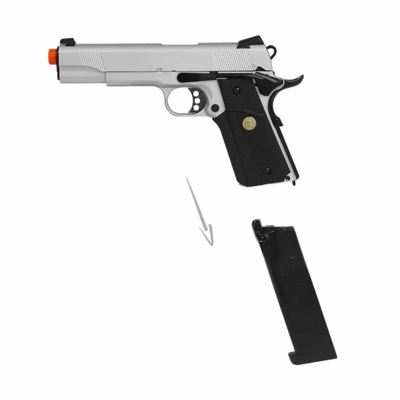 Essa airsoft Glock 1911 Silver possui velocidade média de 320fps (97m/s) com BBs .20g.