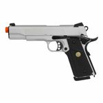 A pistola 1911 Silver Double Bell 728Y é uma pistola airsoft, calibre 6mm, um modelo Colt 1911 clássico, com versão cromada silver e funcionamento por Green Gás.