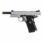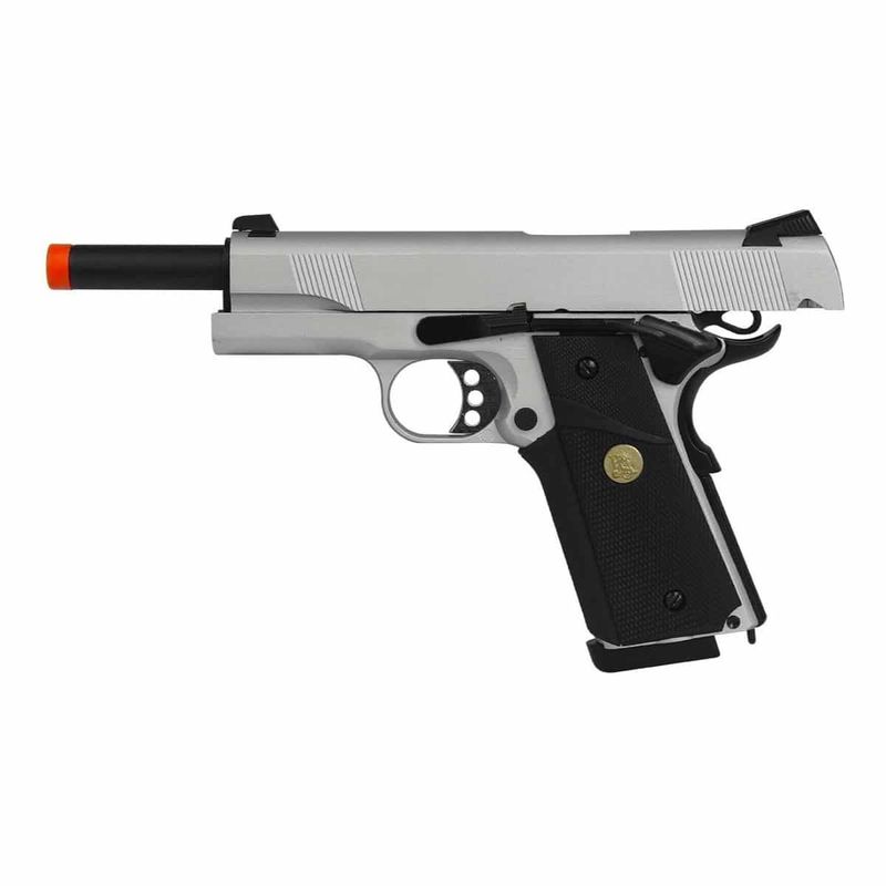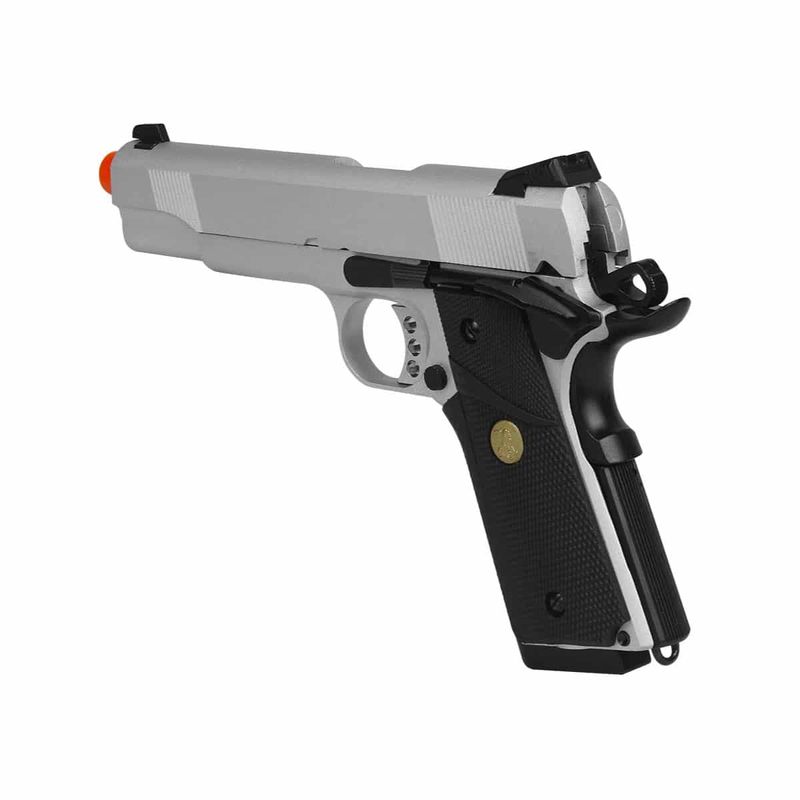 A Pistola Airsoft 1911 Silver Double Bell GBB Blowback Metal dispara no modo Semi Automática com velocidade de 320fps - 98m/s e energia de 1 Joules Ver mais