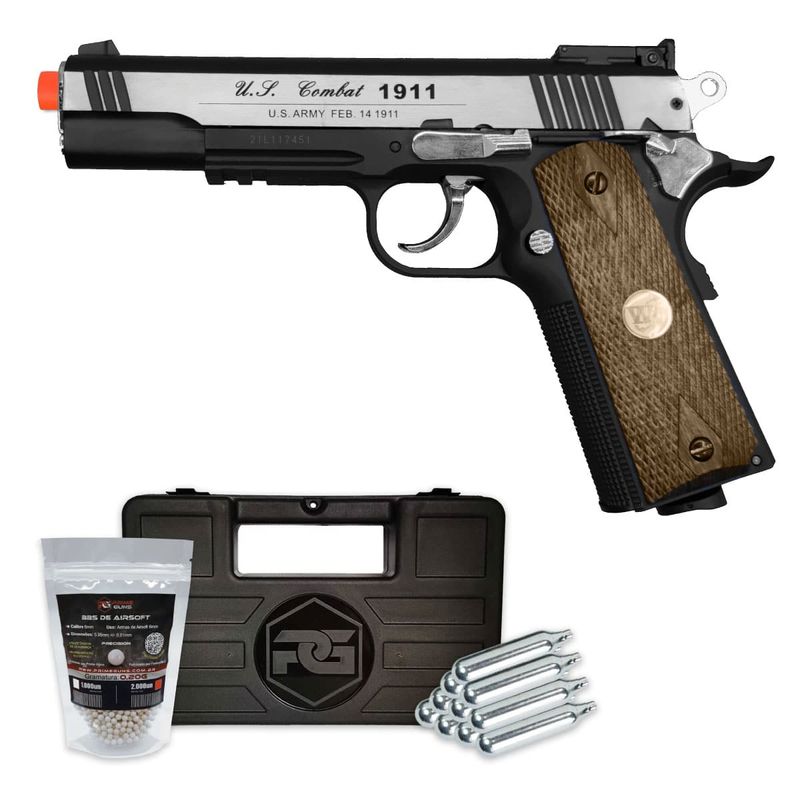 A Pistola Airsoft 1911 Special Combat WG 6mm Metal Slide Kit dispara no modo Semi Automática com velocidade de 459fps - 140m/s e energia de 2 Joules Ver mais
